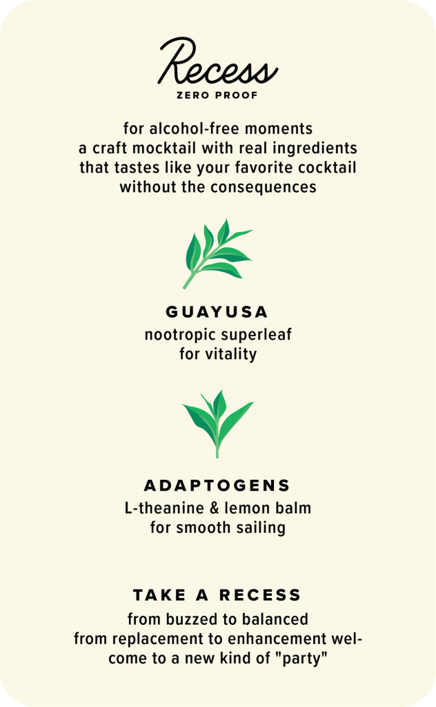 made with real ingredients, uplifting guayusa & balancing adaptogens, Recess Zero Proof is the perfect alcohol alternative